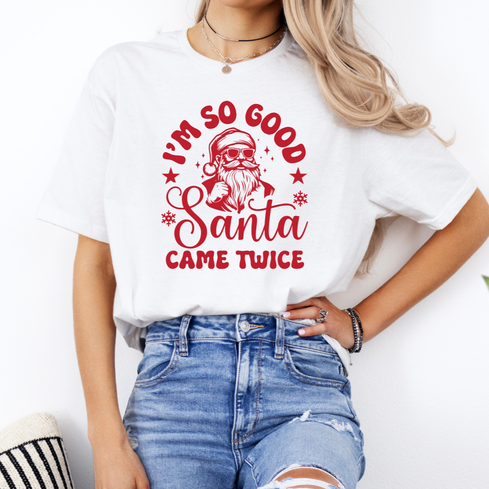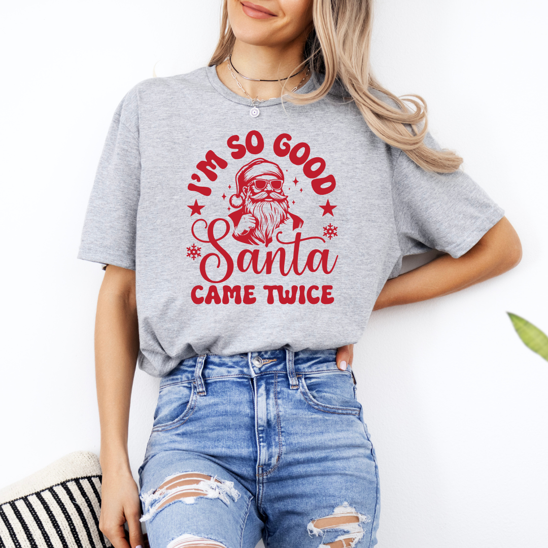 Add some cheeky humor to your holiday wardrobe with our “I’m So Good Santa Came Twice” T-shirt! Featuring a cool Santa Claus sporting sunglasses in the center, this fun design is perfect for holiday parties, gift exchanges, or spreading laughs wherever you go. Made from soft, high-quality fabric, this shirt combines comfort with playful style for those who love to celebrate the season with a wink. Stand out this Christmas with a tee that’s as bold as it is festive!